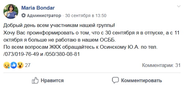М. Бондарь, еще 30 сентября, в группе FB, опубликовала новость о своем уходе с позиции офис-менеджера. Поворот неожиданный, даже для нашей инициативной группы, которая старается держать руку на пульсе.