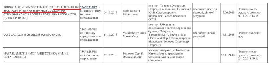 Указанный иск О. Топоров подал против Ю. Осинского 04.10.2017, как указано в Едином реестре судебных решений, то есть О. Топорова исключили из правления после того, как он подал иск против Ю. Осинского: