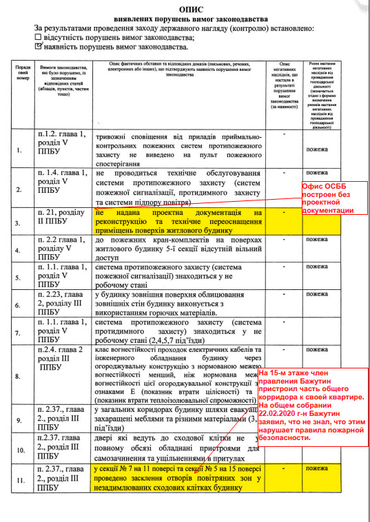 Было выявлено множество нарушений правил пожарной безопасности, которые могут сыграть важную роль в случае пожара в нашем доме. К сожалению, руководство ОСМД не выполнило пункты предписания по результатам проверки. Более того, руководители ОСМД сами нарушают правила пожарной безопасности. Речь идет про бывшего члена правления Заруднева — п.20 предписания и Бажутина — п.11 предписания.